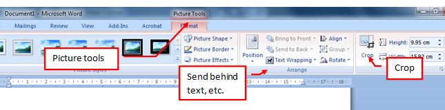 The screenshot can then be edited using the Picture Tools menu (below) allowing you to crop it, send it behind text and so on. To access this menu double-click the picture and it will appear at the top of the screen.