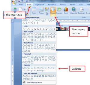 You can also highlight different sections by inserting shapes such as arrows, boxes, text boxes and callouts from the Insert tab by clicking Shapes button.