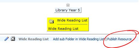 Not all folders can be added to by everybody. I only have access to the second tier of folders where I can create sub folders and publish resources. You may need to get in touch with SAC or your dept head before you can publish resources. Once you have done so, the publish resource link is next to the sub folders link. Clicking this link will put the resource into the folder that you have selected.
