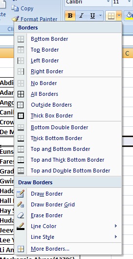 Excel spreadsheets look like they have a border around them already so you might be surprised, when you go to print them, that they actually don’t. To put one in, select the area you want the borders to be around from top-right to bottom-left then click the arrow next to the Border button on the Home tab (pictured below). This will open a drop down menu where you can choose how many sides your border has. Select All borders.