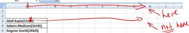 By now your students’ names will be hanging over the edges of their boxes so we need to resize the A column. To do so, put the cursor between the A and the B column at the top and double-click. This should automatically resize column A to the width of the longest student’s name.