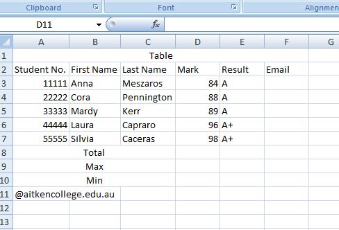 Excel has a range of functions that can be used in your spreadsheet to manipulate your data. Some of the simple things you might like to do are to work out the sum of a column, the highest and lowest numbers in that column and to merge two cells together. In order to do this, I will be using the table below.