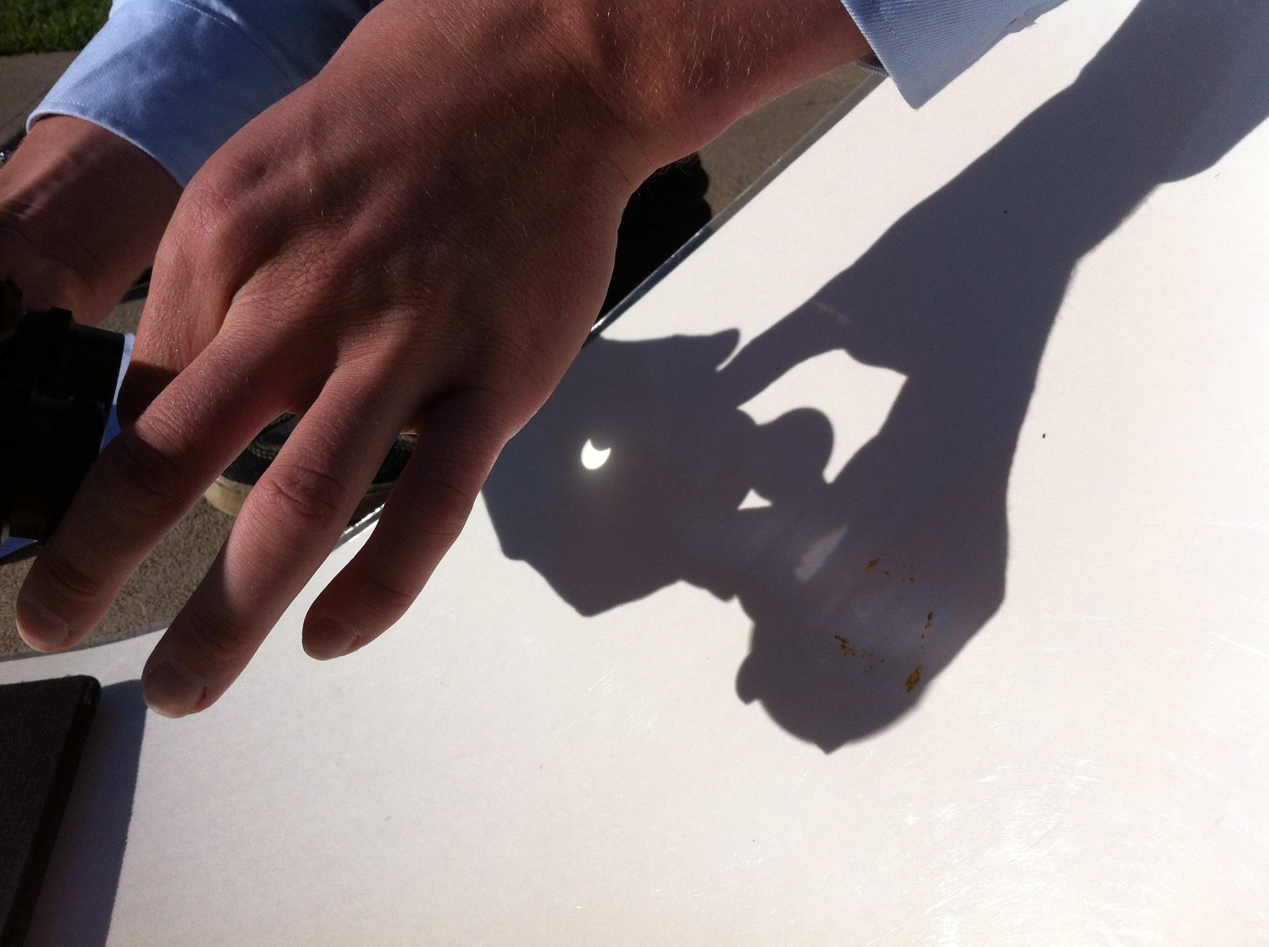 In the middle of JM’s shadow puppets you can clearly see the sun with its upper right-hand side obscured by the moon as it passes away from covering more than half of the sun’s surface just after 8:06am. ‘We’ were able to catch this by projecting an image of the sun through one side of a pair of binoculars onto a piece of paper. Others observed the moment with cameras mounted with special lenses and the lucky ones were able to watch it directly though a welding mask. Wish I had a welding mask.